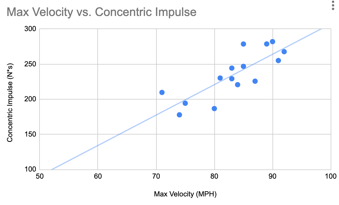 Research consistently demonstrates a strong positive correlation between CMJ concentric impulse and max fastball velocity in pitchers (e.g., r ≈ 0.68–0.71 in Division I collegiate studies), underscoring the transfer of lower-body explosive power through the kinetic chain to mound velocity.